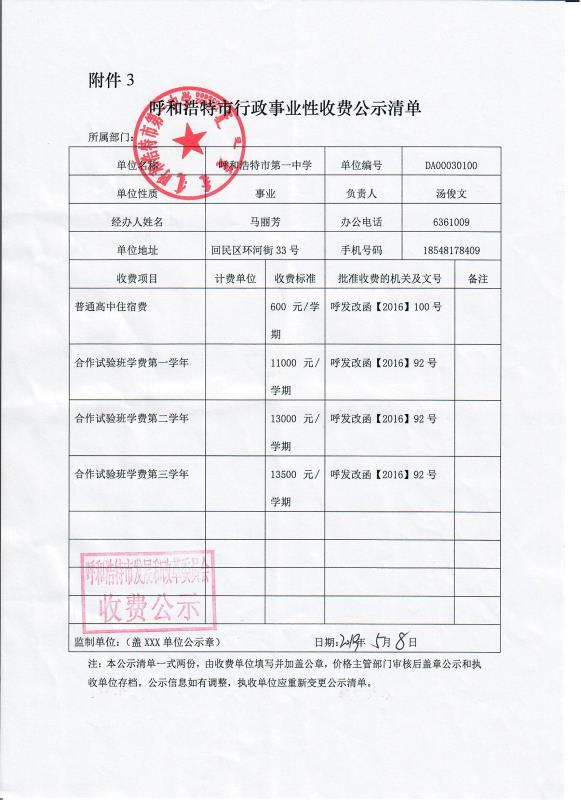 2019年呼市行政事業(yè)性收費(fèi)公示清單