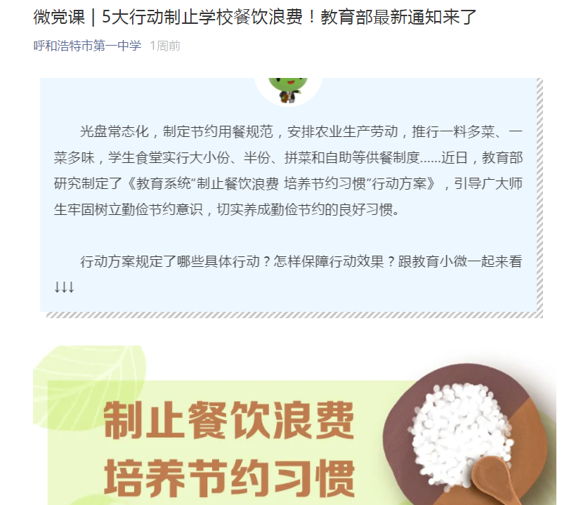 約低碳是現(xiàn)代文明生活新風(fēng)尚。呼市一中黨委第一時間傳達(dá)各級黨委的指示精神,成立工作組,按照呼市教育局《開展厲行節(jié)約、杜絕餐飲浪費(fèi)專項工作實施方案》的要求,制定《呼市一中關(guān)于開展制止餐飲浪費(fèi)、培養(yǎng)節(jié)約習(xí)慣行動實施方案》,利用校園廣播、標(biāo)語、掛圖、公眾號“微黨課”等媒介,多種形式宣傳制止餐飲浪費(fèi),讓節(jié)約教育在學(xué)校隨處可見,營造濃厚氛圍,提高全校師生對餐飲浪費(fèi)的政治自覺,在全校倡導(dǎo)健康文明節(jié)約的餐飲消費(fèi)方式。
