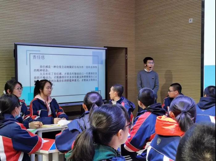孟慶宇老師以一則社會新聞視頻導入,引導學生們思考:如果上學路上,遇到了紅燈,為了按時到班,是否要闖紅燈?生活中處處有責任,我們都是責任的踐行者,當代青年,我們更要勇?lián)鐣熑?。緊接著,孟老師又讓同學們寫下并分享:你擔負過哪些社會責任?同學們經(jīng)過了詳細認真的思考,踴躍發(fā)言,每個小組都分享了本組承擔過的社會責任,同學們以小事為抓手,談到了日常學習生活的方方面面中應該承擔的責任,也提及了從社會層面、國家層面應當積極實踐的責任。最后,孟老師以第三個思考題,讓大家寫下:未來,我想成為一個________的人,我想要對(自己/家庭/社會)承擔起________責任,為此我現(xiàn)在應該_________。孟老師以人民日報的視頻——全民抗疫的點滴事跡為結(jié)語,鼓勵學生們積極踐行社會責任,點滴之間,從小事做起,從自身做起,實現(xiàn)自我價值。