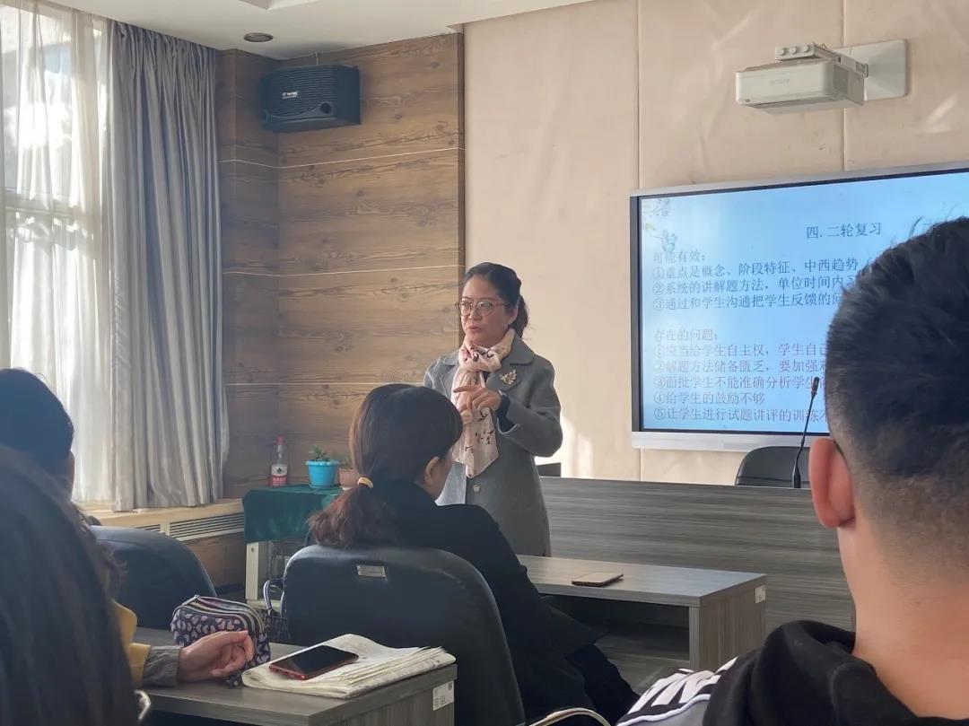 賀怡老師從文理分科前、深度學習、一輪復習、二輪復習等不同階段提供了自身的工作與學習經(jīng)驗。賀怡老師在文理分科之前教學方面注重趣味教學,吸引學生學習歷史的興趣;在深度學習階段盡可能讓學生形成一套知識細致完整的筆記,注重基礎知識的考察;在一輪復習階段注重將點與點、事與事之間的聯(lián)系再強化,重視史料研讀,適當滲透新教材;在二輪復習階段通過“保干穩(wěn)枝”的方式強化學生關于基礎概念、中西趨勢的認知。賀怡老師的分享使得組內(nèi)青年教師受益匪淺。
