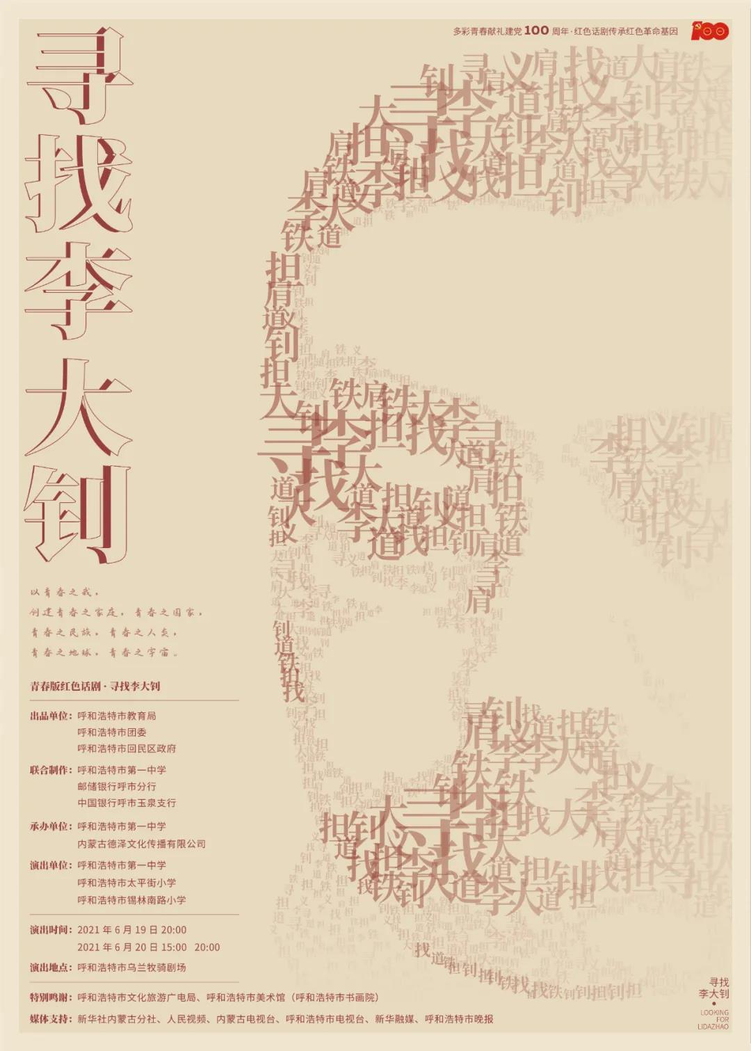 為了深入貫徹習(xí)近平總書記在黨史學(xué)習(xí)教育動員大會上的講話精神,著力講好黨的故事、革命的故事、英雄的故事,厚植師生愛黨、愛國、愛社會主義的情感,讓紅色基因、革命薪火代代傳承。呼和浩特市第一中學(xué)發(fā)起并組織多家單位排演青春版紅色話劇《尋找李大釗》,以體驗式學(xué)習(xí)黨史,讓黨史學(xué)習(xí)教育活起來,用多彩青春獻(xiàn)禮建黨一百周年。該劇由呼和浩特市教育局、呼和浩特市團(tuán)委、呼和浩特市回民區(qū)政府出品,呼和浩特市第一中學(xué)、郵儲銀行呼市分行、中國銀行呼市玉泉支行聯(lián)合制作,呼和浩特市第一中學(xué)、太平街小學(xué)、錫林南路小學(xué)參與演出。目前正在緊張排練中,即將于6月19日燃情上演,敬請關(guān)注!