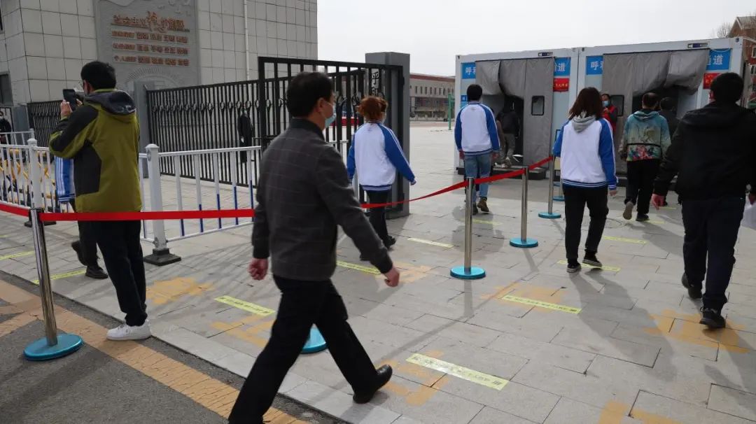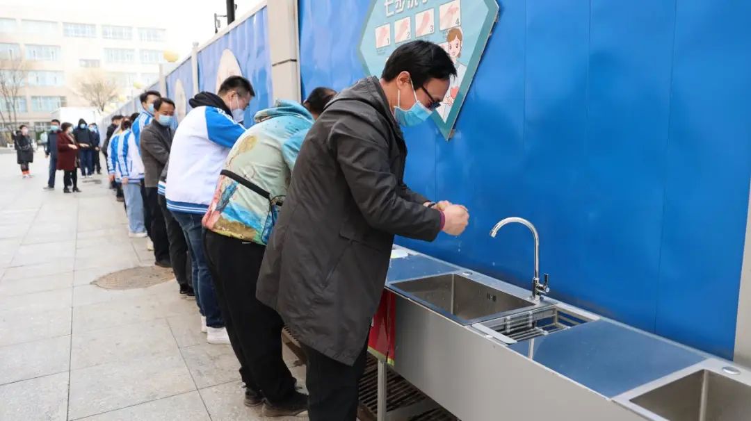 學(xué)生間隔一米距離,從校園北門(mén)測(cè)溫通道入校。