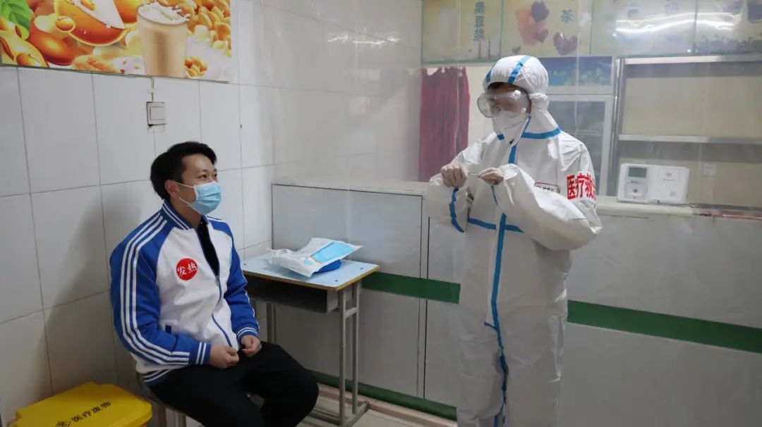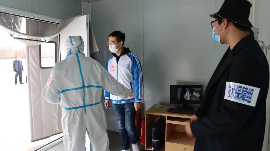 學(xué)生體溫仍異常,發(fā)熱學(xué)生穿戴防護(hù)服,帶入隔離室,等待轉(zhuǎn)運(yùn)。