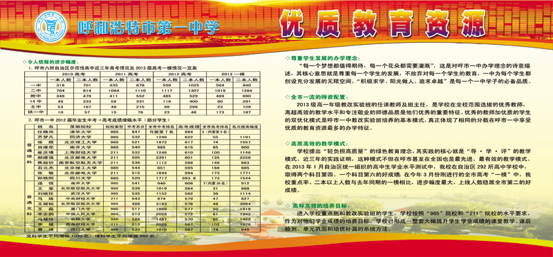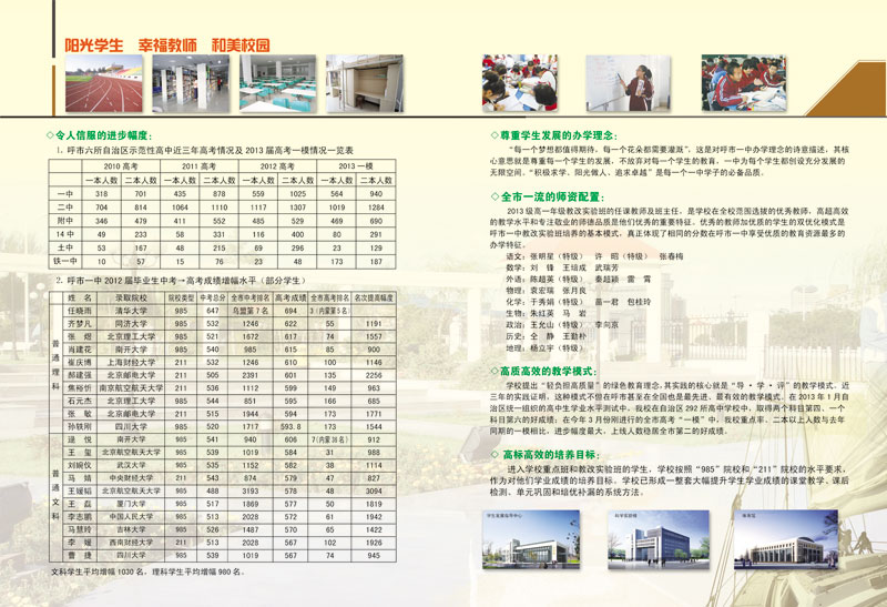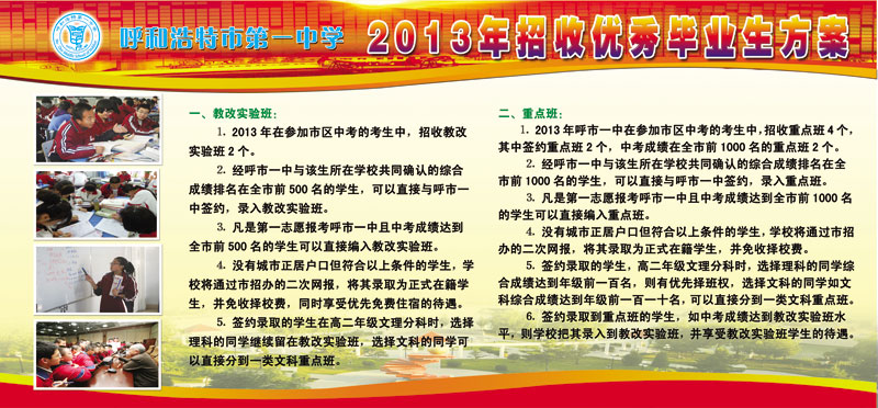 二、重點班: 1. 2013年呼市一中在參加市區(qū)中考的考生中,招收重點班4個,其中簽約重點班2個,中考成績在全市前1000名的重點班2個。