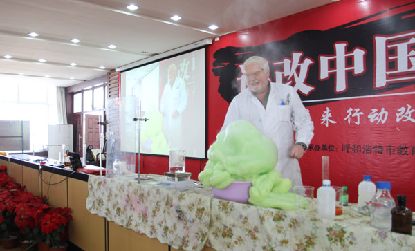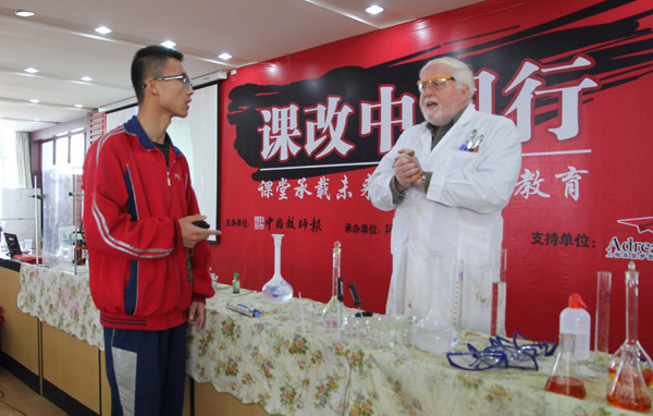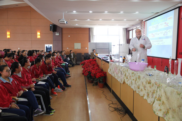 北京化工大學(xué)招生辦主任許海軍博士為我校高三年級(jí)的理科學(xué)生介紹了北化2016年的招生政策,北化化工資源有效利用國(guó)家重點(diǎn)實(shí)驗(yàn)室特聘教授David為我校高三年級(jí)的師生帶來了精彩的學(xué)術(shù)報(bào)告及現(xiàn)場(chǎng)實(shí)驗(yàn)演示。