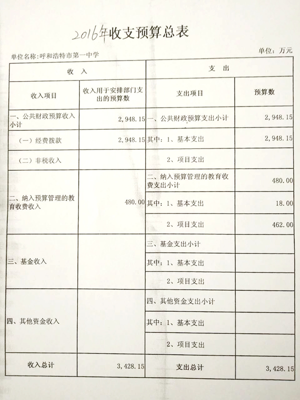呼和浩特市第一中學(xué)2016年收支預(yù)算總表
